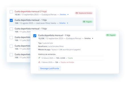 Gana visibilidad, reduce errores y evita impagos con todas las finanzas del club centralizadas y siempre actualizadas.